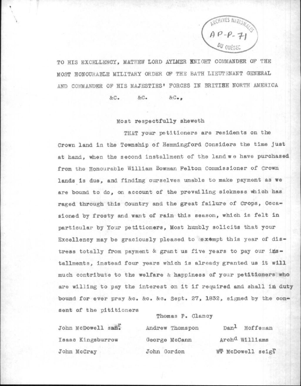 Pétition faite par Thomas P. Clancy pour Lord Aylmer