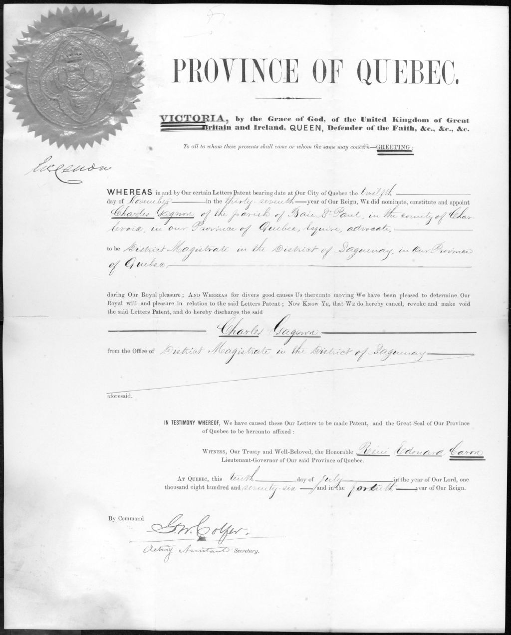 - Ce dossier est constitué d'un révocation comme magistrat, district du Saguenay