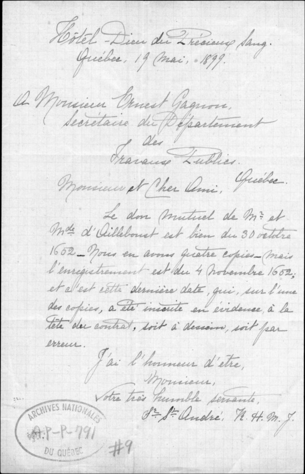 - Ce dossier est constitué de lettres de Charles Colville (1888), N.-E. Dionne (1889), M. Hermeline (1892-1893, 1901, s.d.), A.-R. Angers (1893), de Soeur Saint-André (1899) et de Roch Magnan (1900) à Ernest Gagnon (1834-1915) ainsi que d'une copie dactylographiée