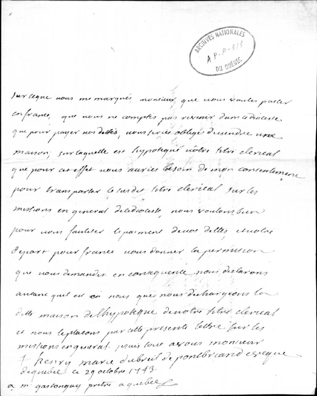Lettre de Mgr Pontbriand au prêtre Louis-Bernard Castonguay