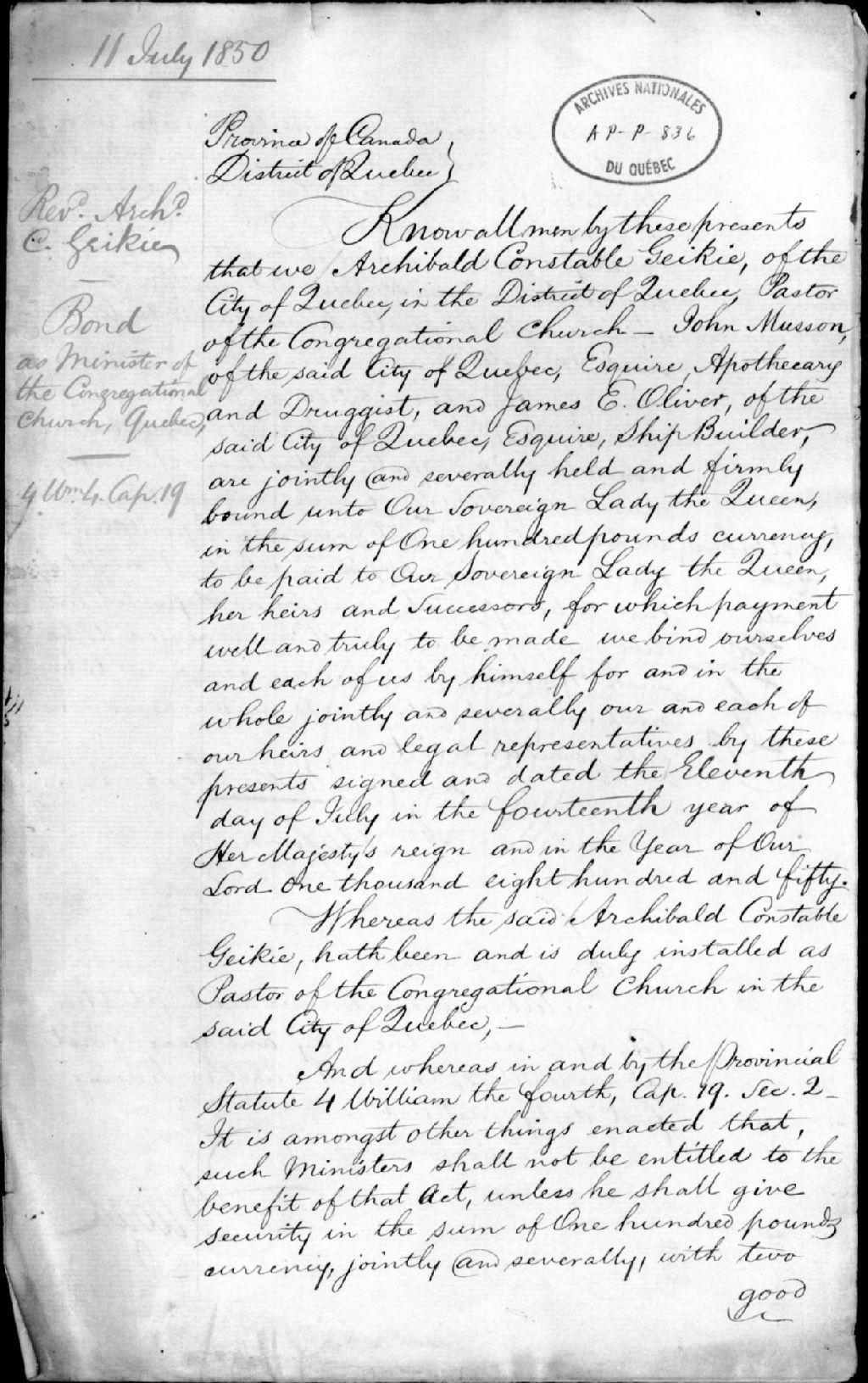 - Ce dossier est constitué d'un document de son engagement comme ministre de l'église congrégationaliste de Québec, ainsi que de son serment d'allégeance à Sa Majesté