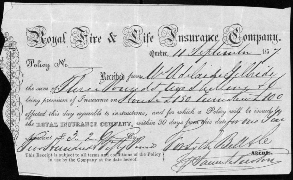 Ce dossier est composé de deux polices d'assurance de la Royal Insurance Co. sur des propriétés et 5 reçus de paiement pour celles-ci