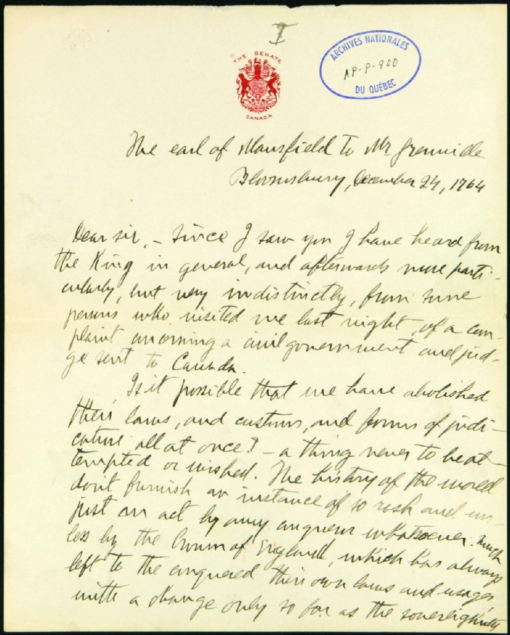 - Lettre du comte de Mansfield au Lord Grenville concernant l'application des lois au Canada