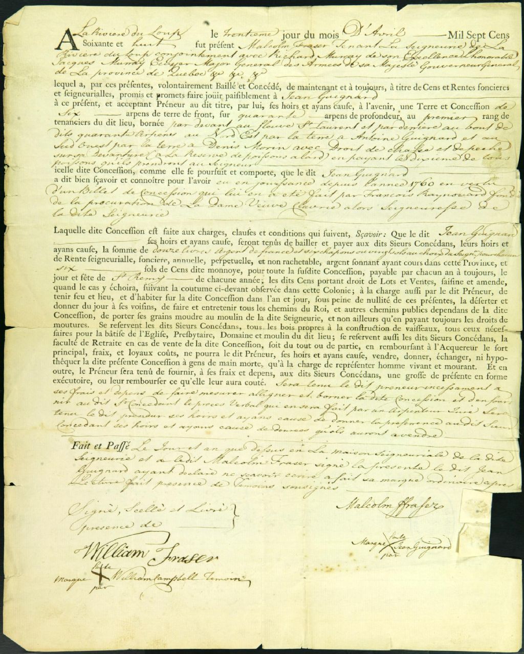 Contrat de concession par Malcolm Fraser à Jean Guignard, 30 avril 1768, Archives nationales à Québec, Collection Centre d'archives de Québec, (03Q,P1000,S3,D917).
