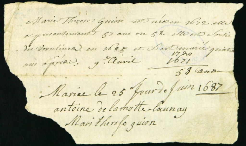 Notes biographiques concernant Marie-Thérèse Guion, [Vers 1730], Archives nationales à Québec, Collection Centre d'archives de Québec, (03Q,P1000,S3,D921).