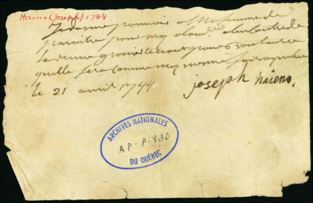 Procuration de Joseph Hains, 21 avril 1744, Archives nationales à Québec, Collection Centre d'archives de Québec, (03Q,P1000,S3,D930).