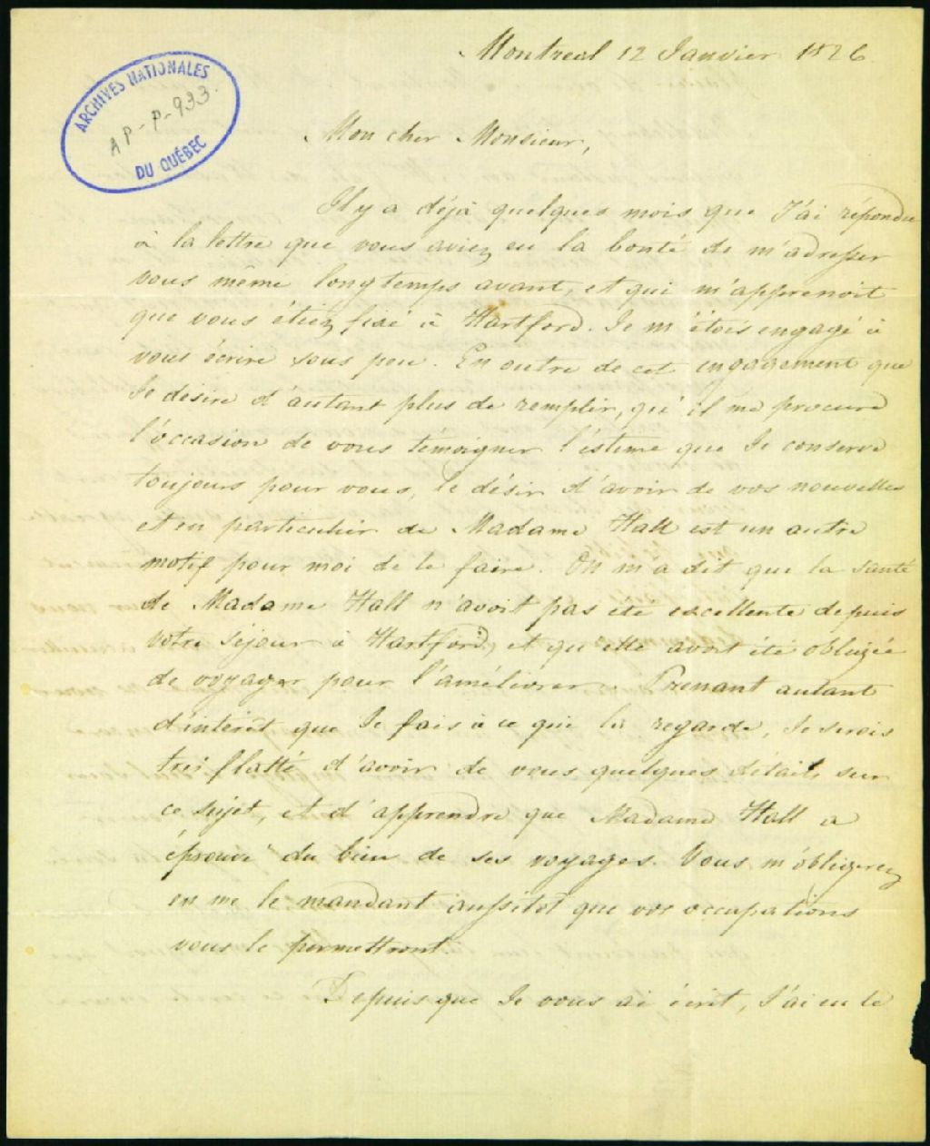 - Lettre de Côme-Séraphin Cherrier à F. Hall