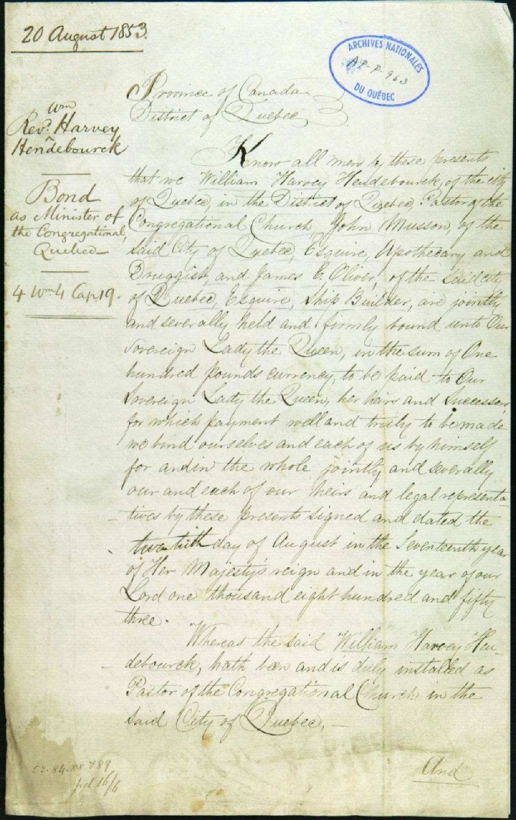 Caution attribuée à Harvey Henderbourk pour une église congrégationaliste, 20 août 1853, Archives nationales à Québec, Collection Centre d'archives de Québec, (03Q,P1000,S3,D963).