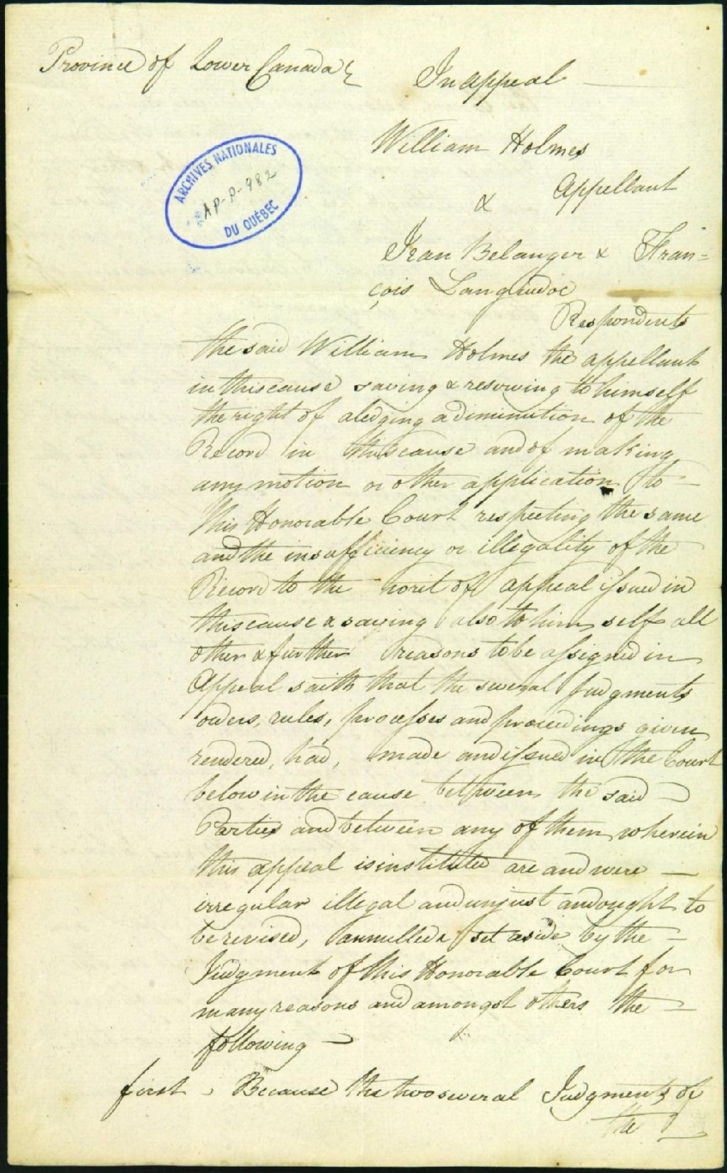 - Ce dossier est constitué d'une pièce du procès de William Holmes contre Jean Bélanger et François Languedoc, Québec, 26 juin 1818; d'une procuration à Pierre Boisseau par Anne Johnson, veuve de feu William Holmes, et par Arabella Holmes, femme de Robert Bellingham, concernant les héritiers Holmes, 31 décembre 1837. Les deux documents sont en copies manuscrites