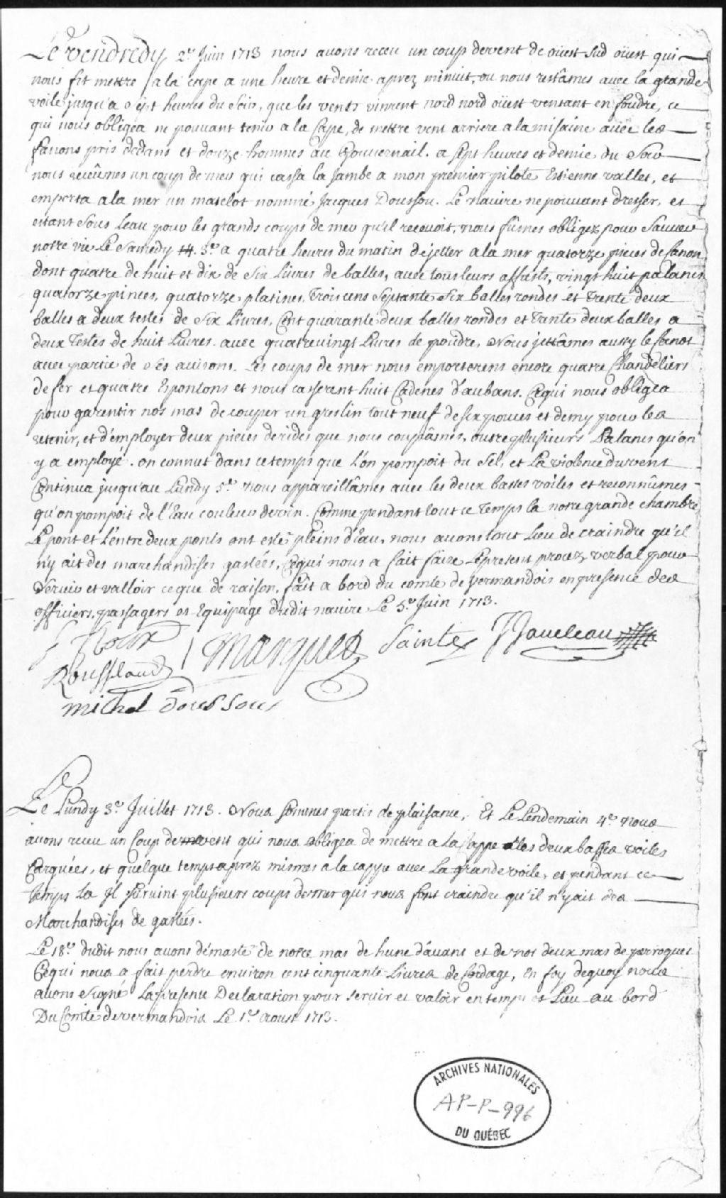 - Ce dossier est constitué d'un procès-verbal concernant les dommages subis par le navire Le Comte de Vermandois en 1713. Le document porte les signatures des personnes suivantes: Michel Doussont, J. Javeleau, Marquet, Rousselaud, F. Roux, Sainte