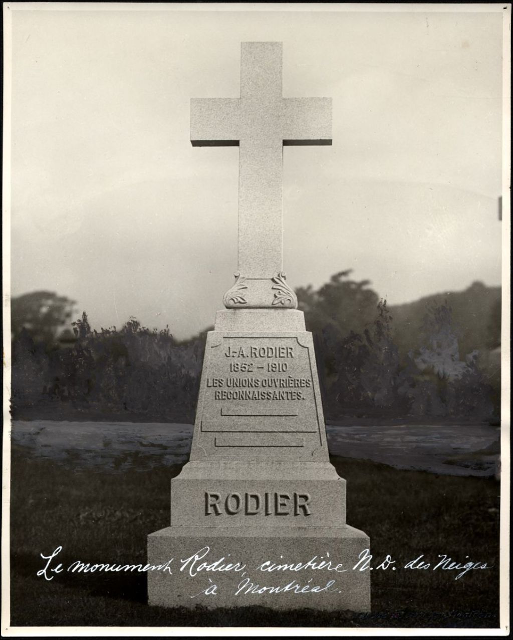 Monument J.A. Rodier, cimetière Notre-Dame-des-Neiges à Montréal, [vers 1923], Archives nationales à Québec, Collection Centre d'archives de Québec, (03Q,P1000,S4,D19,P114), Edgar Gariépy.