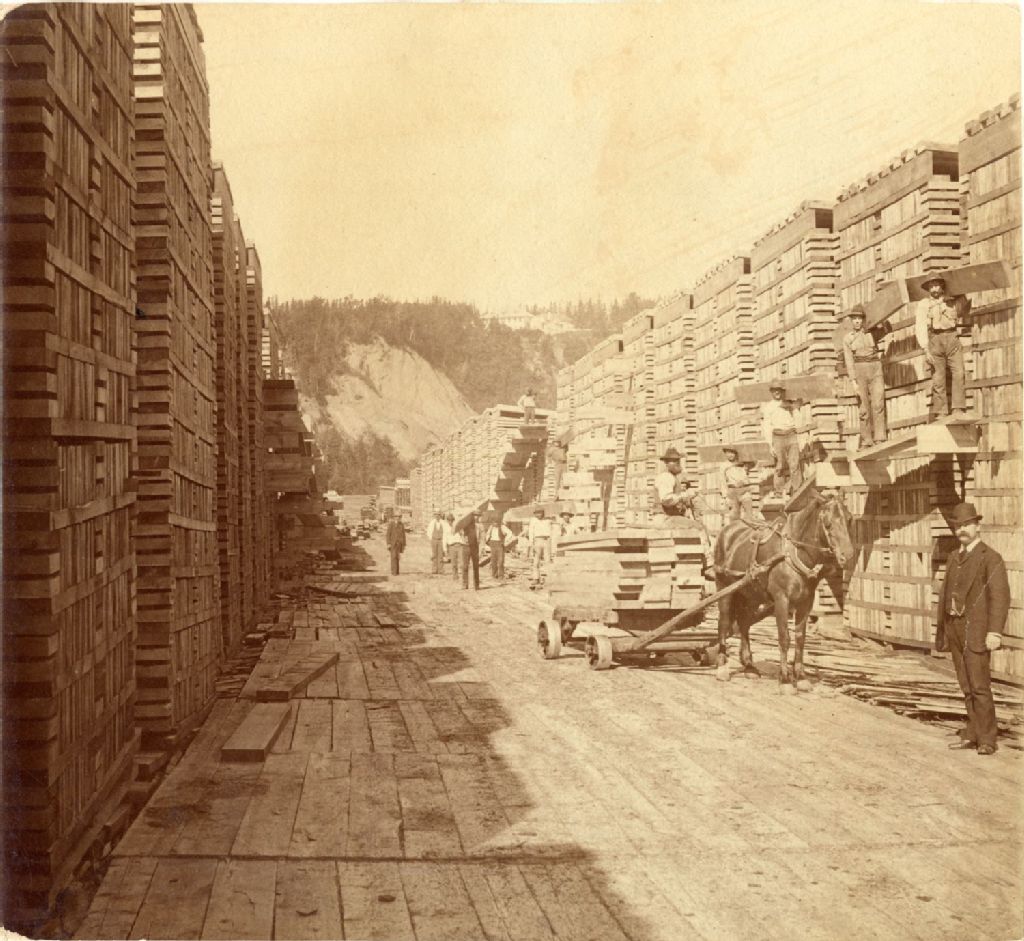 Longue passerelle de bois, hautes pilles de planches de chaque côté, charrette attelée et hommes au travail