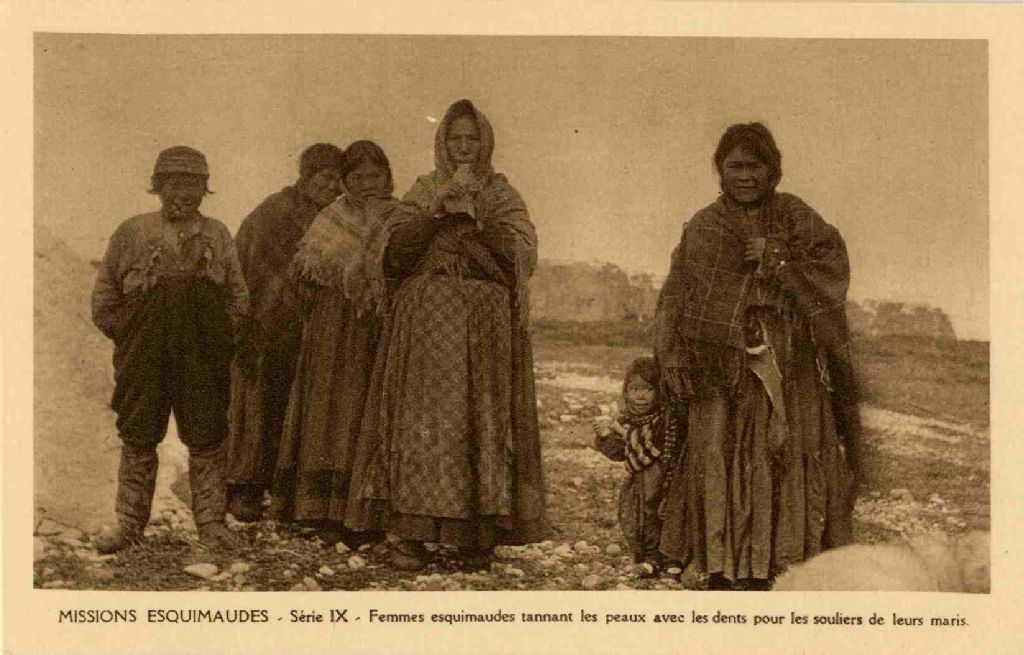 Mission Esquimaudes, série 9, Femmes esquimaudes tannant les peaux avec les dents pour les souliers de leurs maris (Inuites), [vers 1915], Archives nationales à Québec, Collection Centre d'archives de Québec, (03Q,P1000,S4,D31,P85), Photographe non identifié.