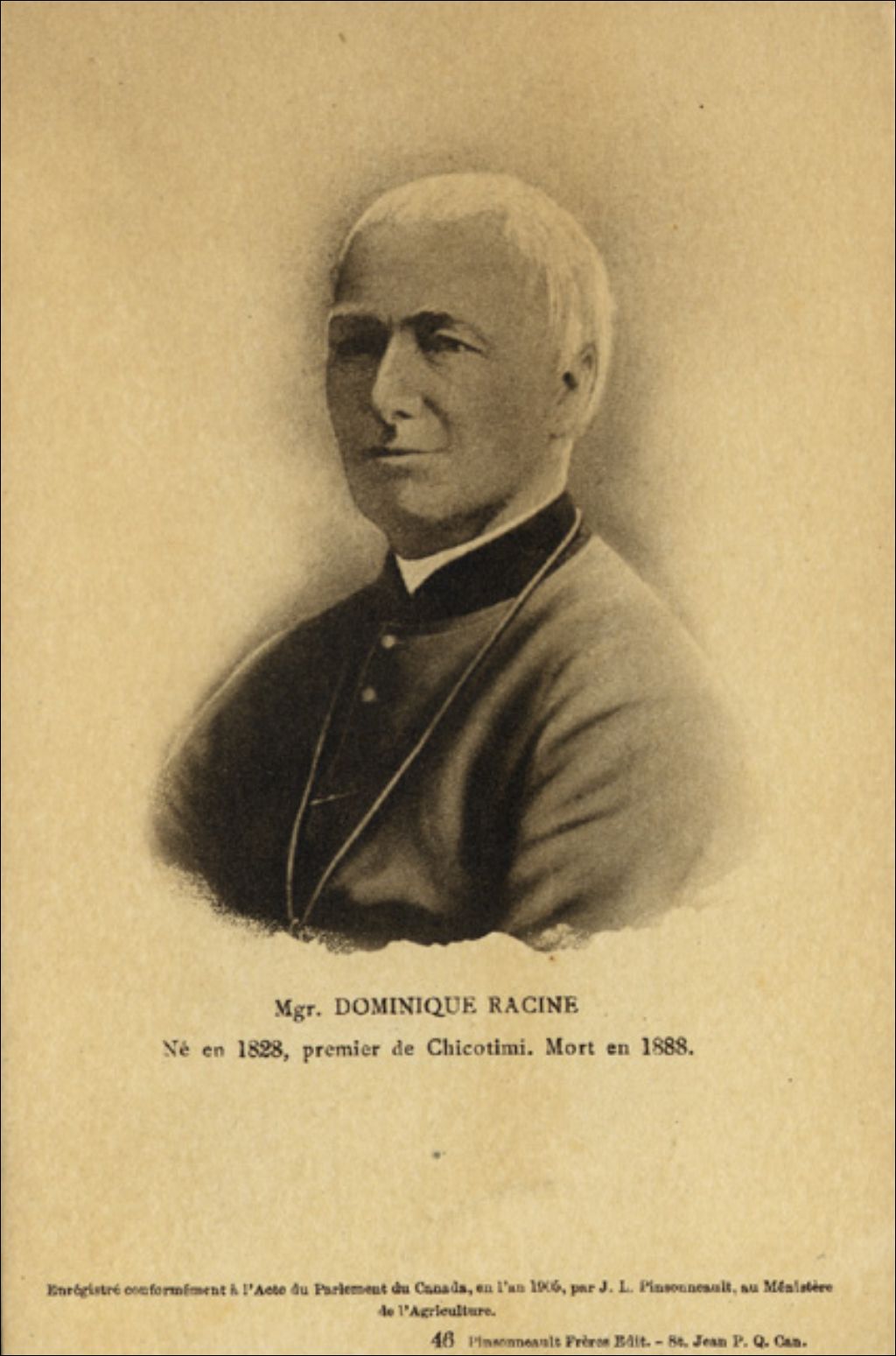 Mgr Dominique Racine, [Vers 1905], Archives nationales à Québec, Collection Centre d'archives de Québec, (03Q,P1000,S4,D83,PR67), Pinsonneault Frères Edit., Saint-Jean.