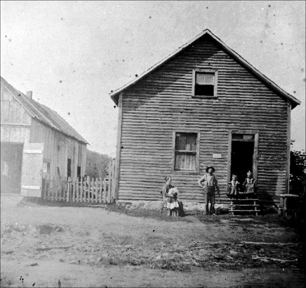 Jeune famille de colons (couple et 3 enfants en bas âge) devant leur maison