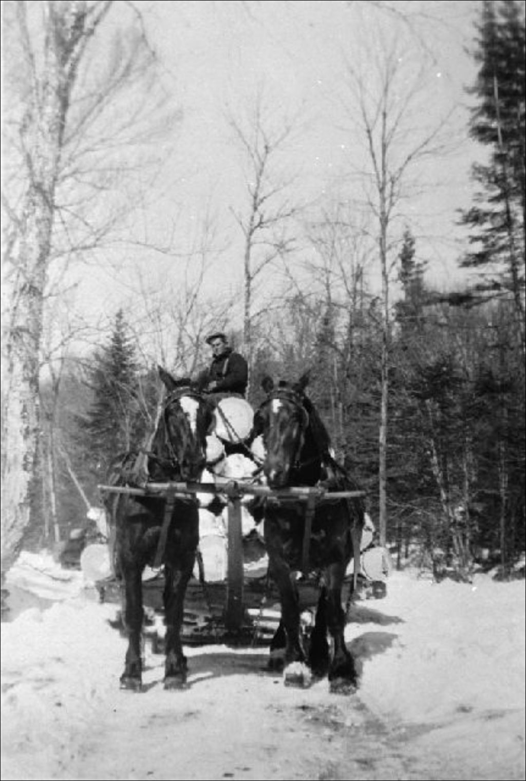 Raoul Pilon sur un voyage de "pitounes" tiré par des chevaux, [192-?], Archives nationales à Gatineau, Fonds Comité des Fêtes de Chénéville, (07H,P83,D62), Photographe non identifié.
