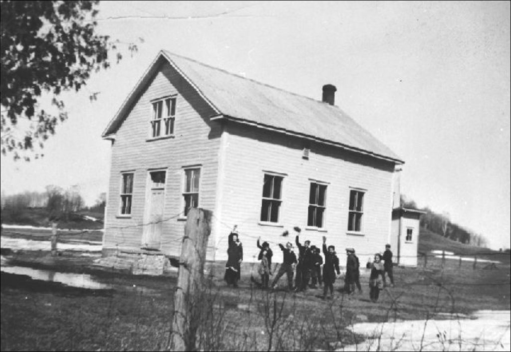 Écoliers jouant devant une petite école de rang située au Lac-Simon