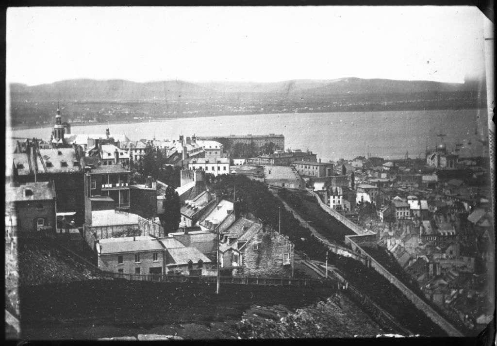 Reproduction à partir d'une épreuve ancienne d'une vue panoramique en plongée prise près du bastion du Roi, au loin la terrasse Durham et l'édifice des douanes