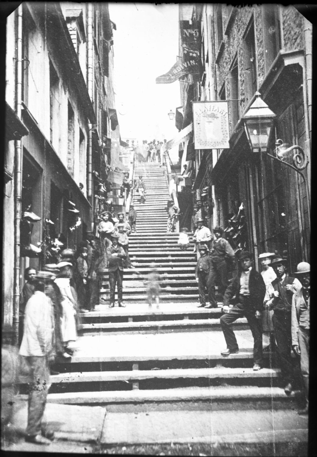 Quartier Vieux-Québec-Basse-Ville - Rue Petit-Champlain - Escalier Casse-Cou - Vers 1870, 1905, Archives nationales à Québec, Fonds Fred C. Würtele, (03Q,P546,D1,P58), L. P. Vallée, Portrait and Landscape Photographer, Quebec.