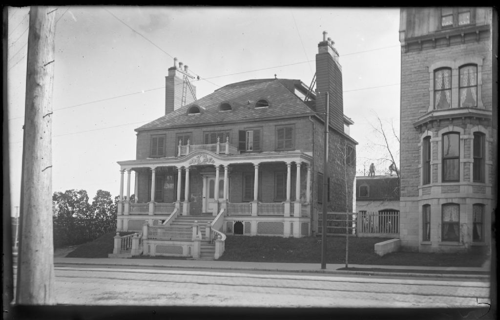 Vue éloignée de la façade et le profil droit de l'ancienne résidence de Abraham Joseph (vers 1880), devenue Lion d'Or Hotel (vers 1890), et début 1900 Dufferin Hotel, propriété de John Barry
