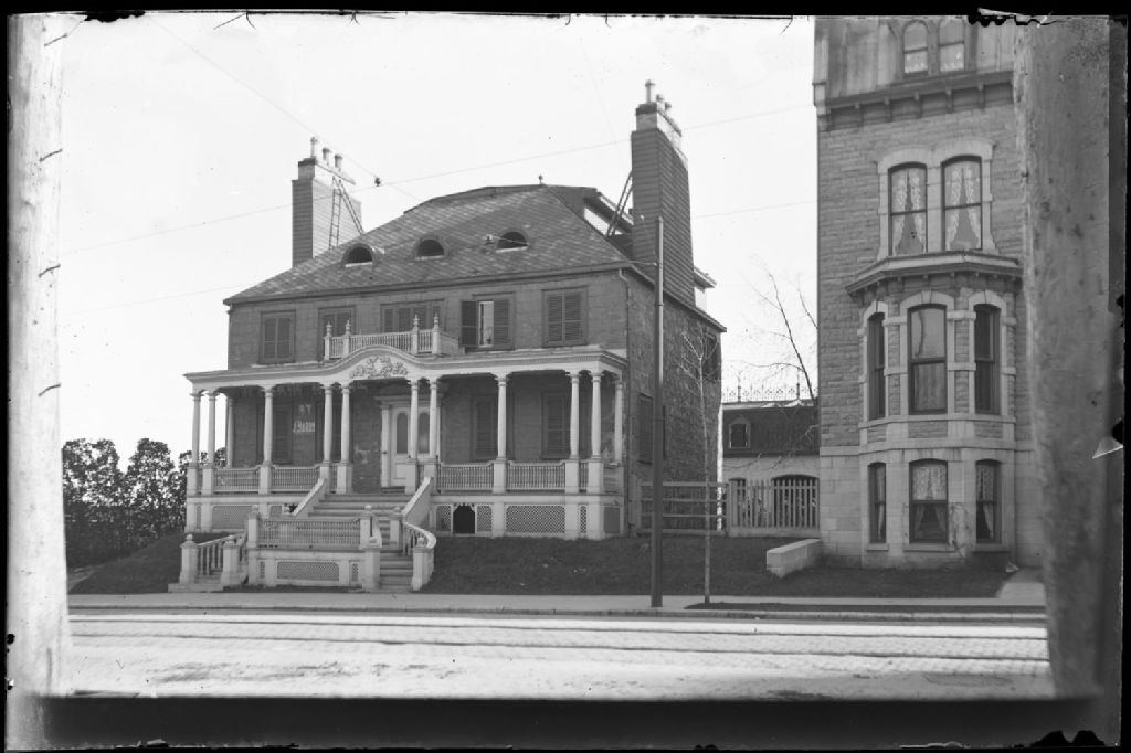 Vue éloignée de la façade et le profil droit de l'ancienne résidence de Abraham Joseph (vers 1880), devenue Lion d'Or Hotel (vers 1890), et début 1900 Dufferin Hotel, propriété de John Barry