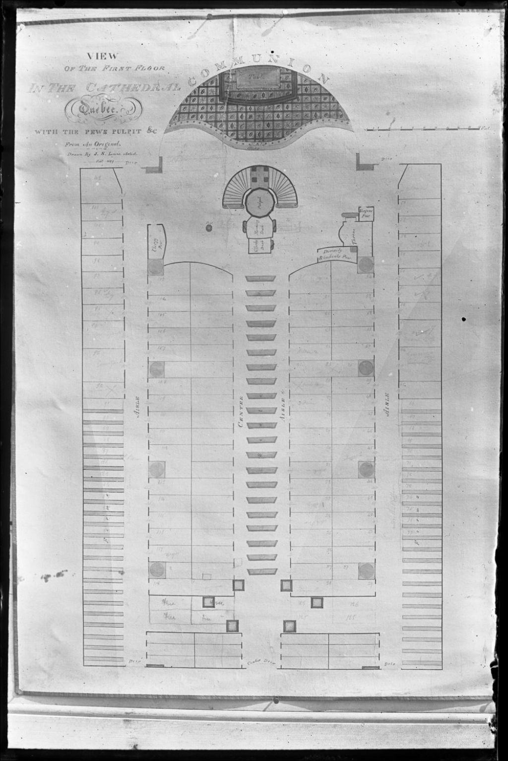 Reproduction photographique du dessin d'une copie d'un plan vue du rez-de-chaussée, les bancs, la chaire etc. de la cathédrale par J. S. Lewis, février 1829