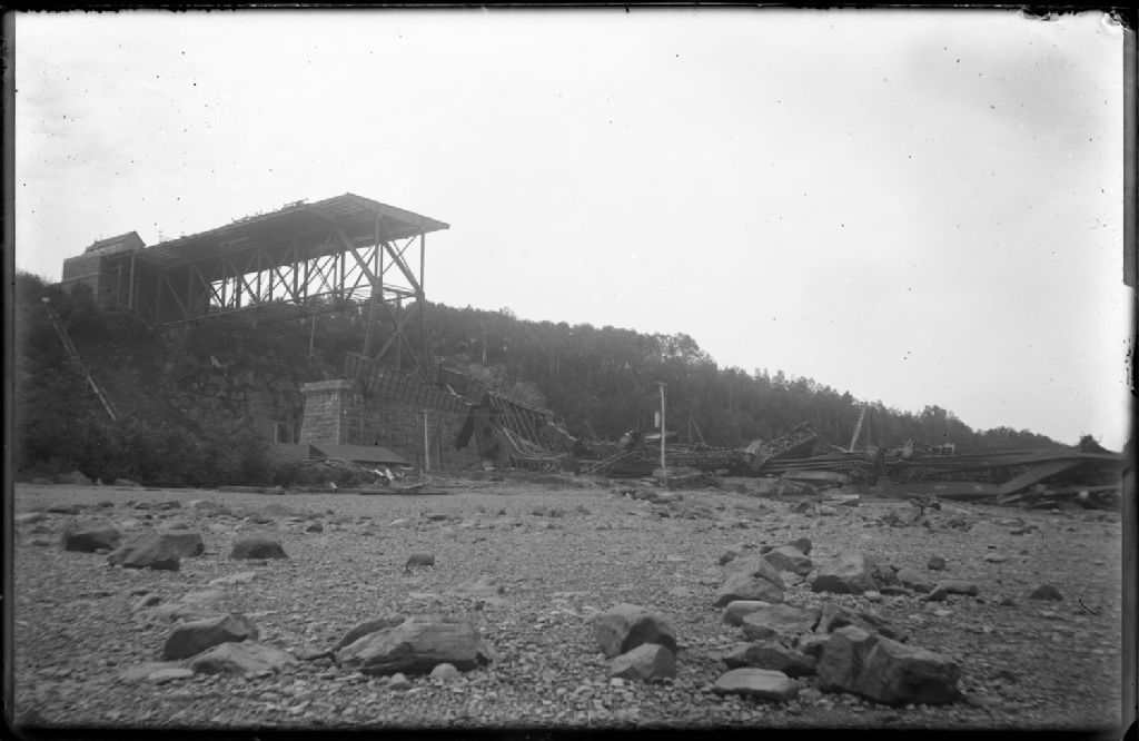 Vue éloignée prise de la rive des débris de la travée lors de la catastrophe