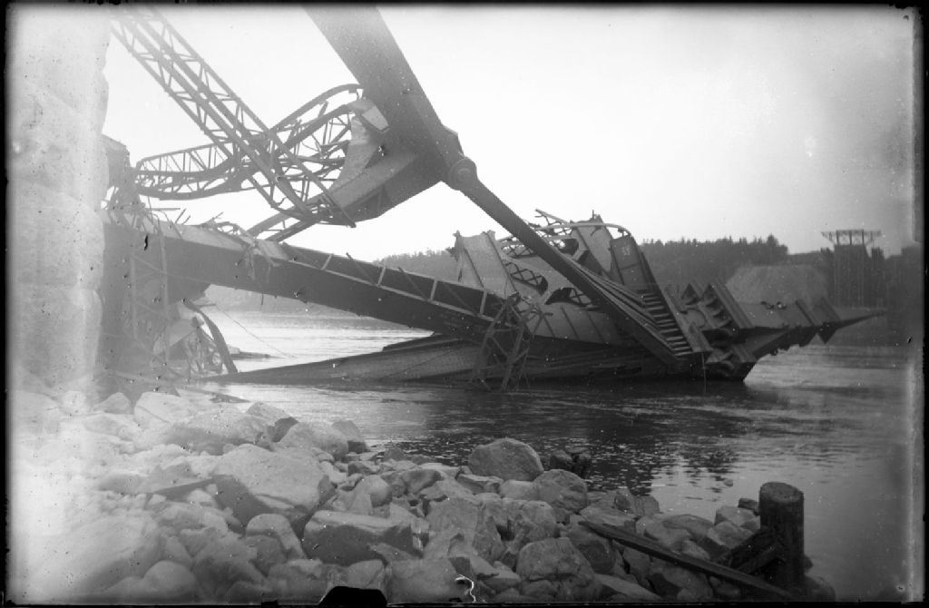 Vue éloignée prise de la rive des débris de la travée lors de la catastrophe