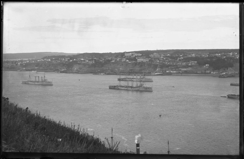 Vue éloignée prise de Québec lors de la visite du Prince Louis de Battenberg (Battenburg, 1854-1921), au loin les navires anglais H.M.S. Drake, Berwick, Bedford, Cornwall, Essex et Cumberland