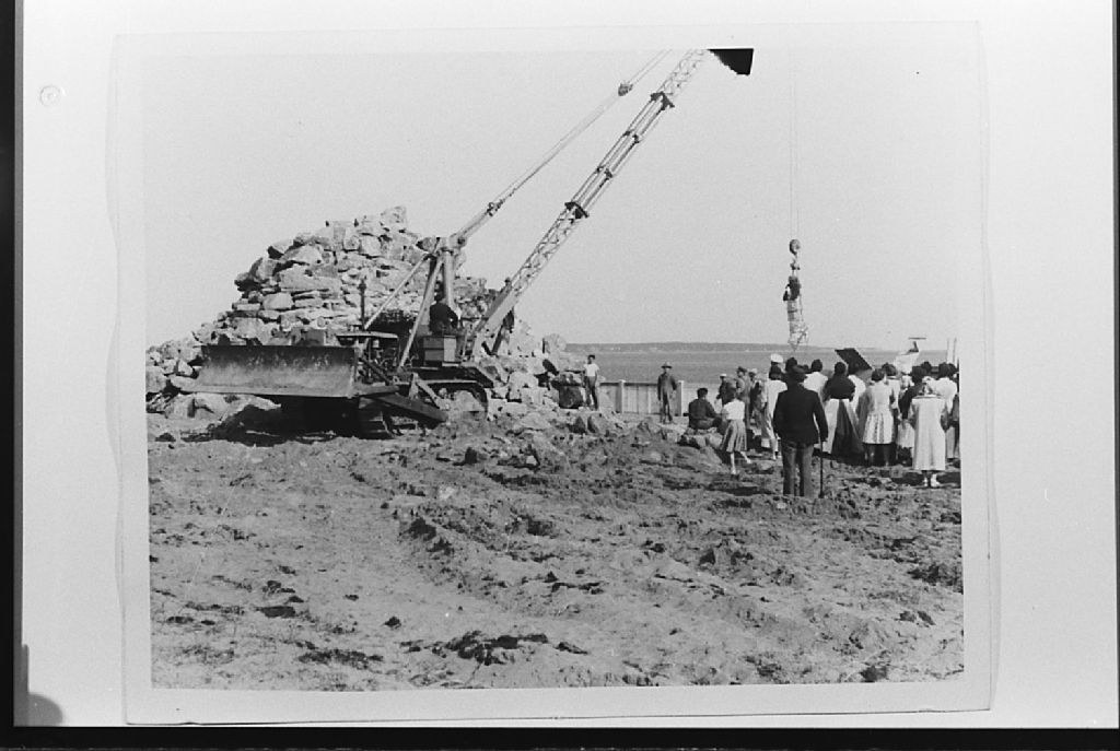 Construction de la grotte à Havre-Saint-Pierre, Négatif reproduit en 1983(original créé en 1954), Archives nationales à Sept-Îles, Fonds Société historique de Havre-Saint-Pierre inc, (09N,P19,S1,SS1,P160), Société historique de Havre Saint-Pierre.