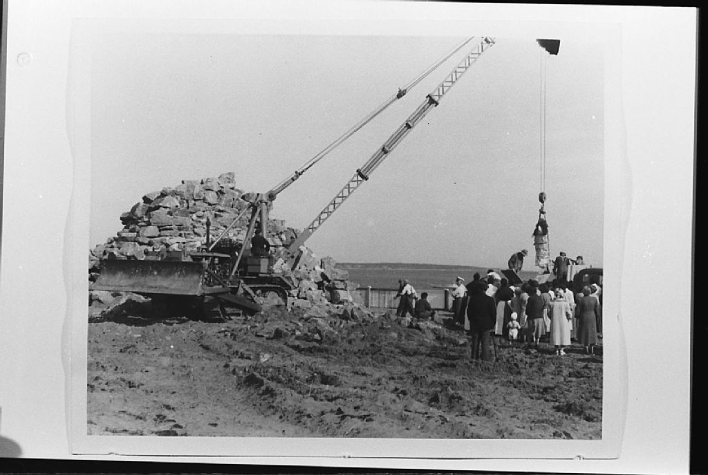 Construction de la grotte à Havre-Saint-Pierre, Négatif reproduit en 1983(original créé en 1954), Archives nationales à Sept-Îles, Fonds Société historique de Havre-Saint-Pierre inc, (09N,P19,S1,SS1,P162), Société historique de Havre Saint-Pierre.