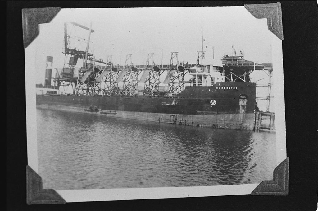 Chargement du bois au port de Port-Menier, Négatif reproduit en 1983(original créé en 1928), Archives nationales à Sept-Îles, Fonds Société historique de Havre-Saint-Pierre inc, (09N,P19,S1,SS1,P280), Société historique de Havre Saint-Pierre.