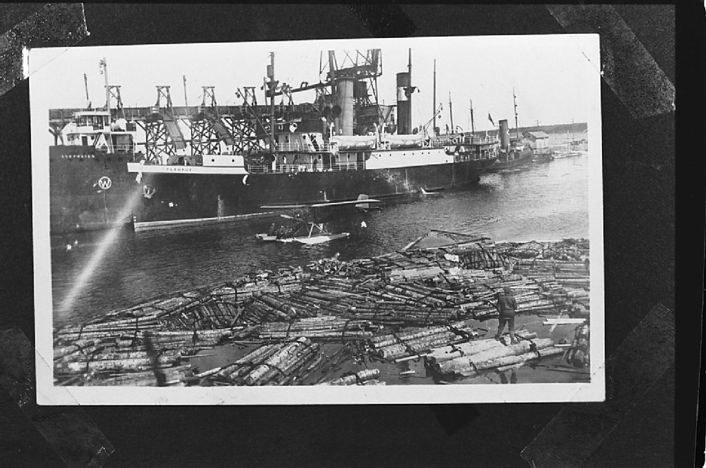 Chargement du bois pour le transport à Anticosti, Négatif reproduit en 1983(original créé en 1928), Archives nationales à Sept-Îles, Fonds Société historique de Havre-Saint-Pierre inc, (09N,P19,S1,SS1,P339), Société historique de Havre Saint-Pierre.
