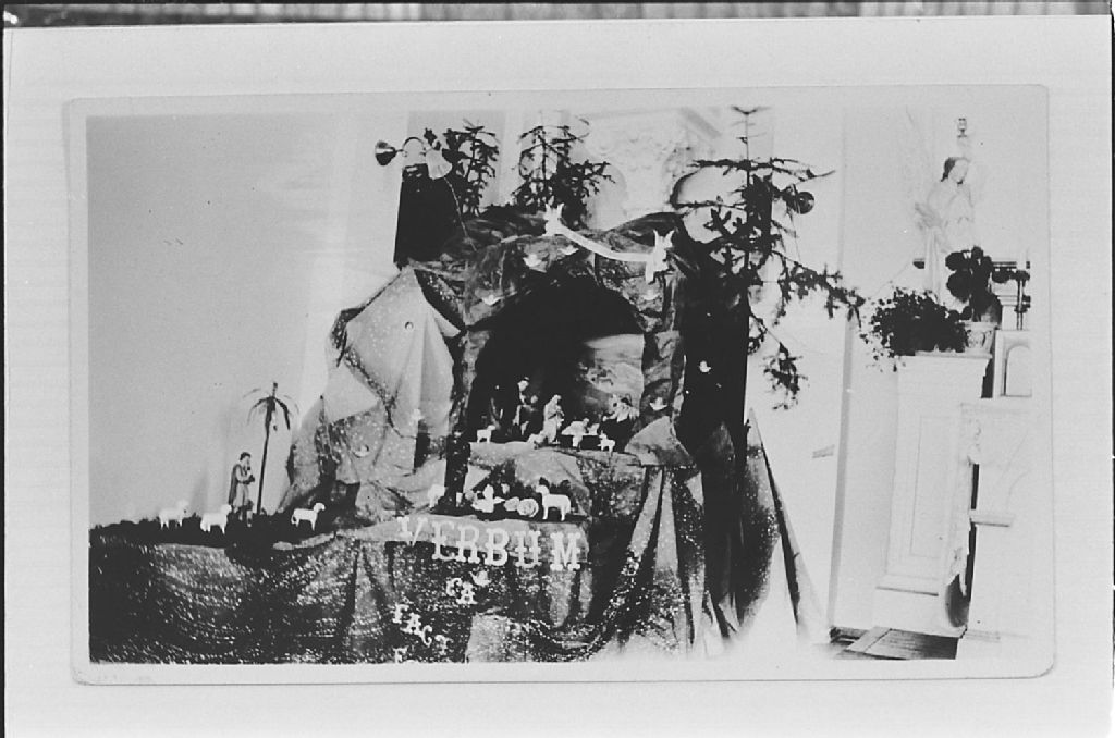Crèche de Noël de l'église de Havre-Saint-Pierre, Négatif reproduit en 1983 (original créé vers 1938), Archives nationales à Sept-Îles, Fonds Société historique de Havre-Saint-Pierre inc, (09N,P19,S1,SS1,P455), Société historique de Havre Saint-Pierre.
