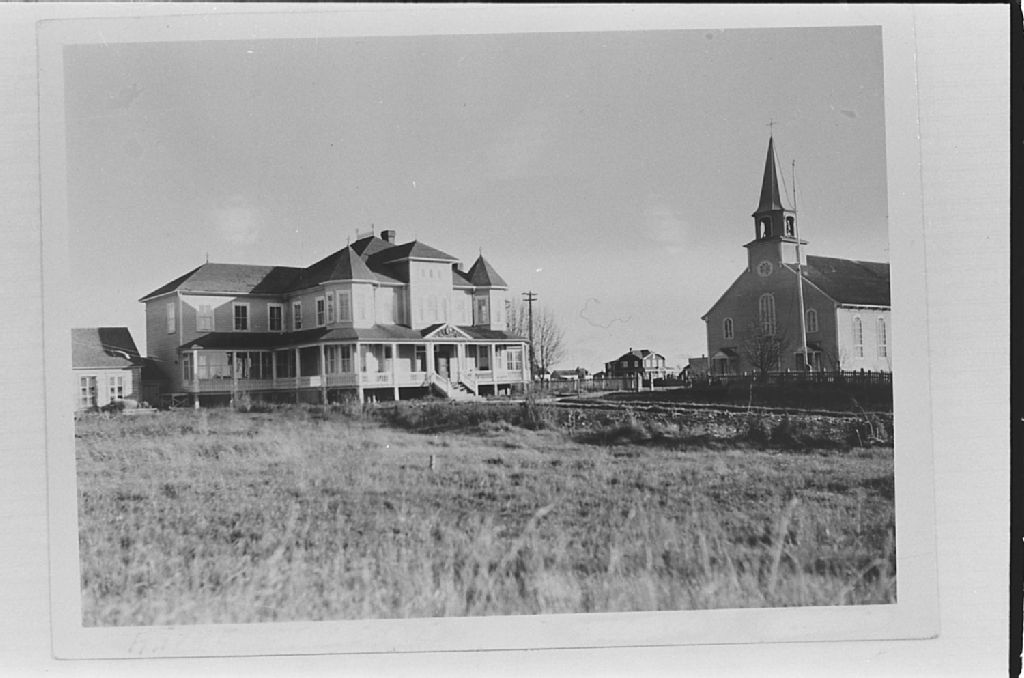 Église et presbytère de Havre-Saint-Pierre, Négatif reproduit en 1983 (original créé vers 1945), Archives nationales à Sept-Îles, Fonds Société historique de Havre-Saint-Pierre inc, (09N,P19,S1,SS1,P464), Société historique de Havre Saint-Pierre.