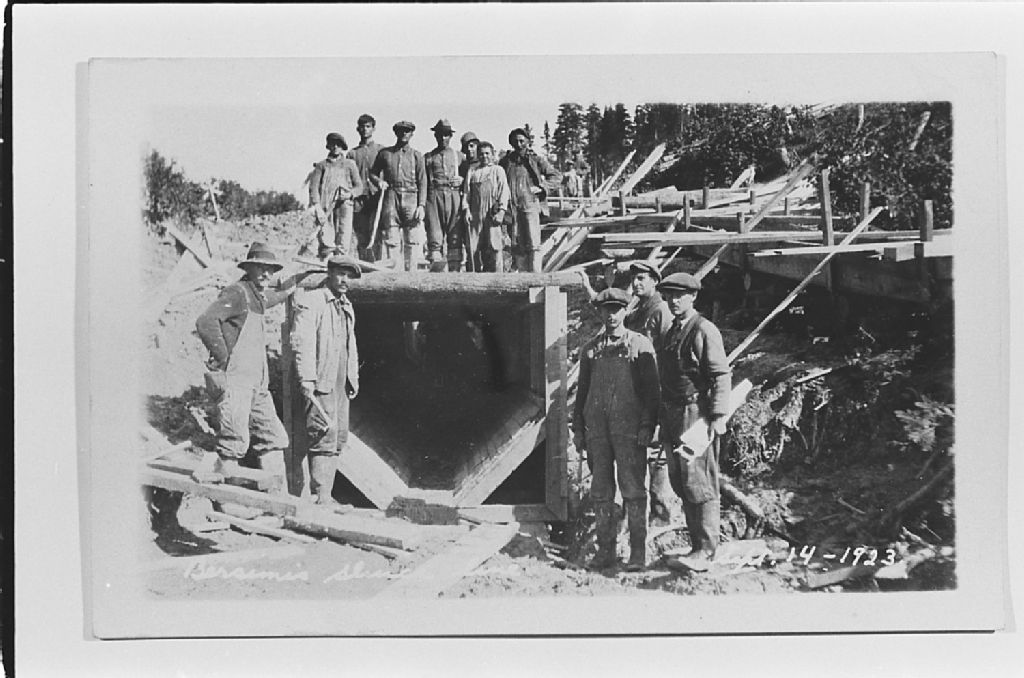 Travailleurs au chantier de construction de Bersimis, Négatif reproduit en 1983 (original créé en 1923), Archives nationales à Sept-Îles, Fonds Société historique de Havre-Saint-Pierre inc, (09N,P19,S1,SS1,P487), Société historique de Havre Saint-Pierre.