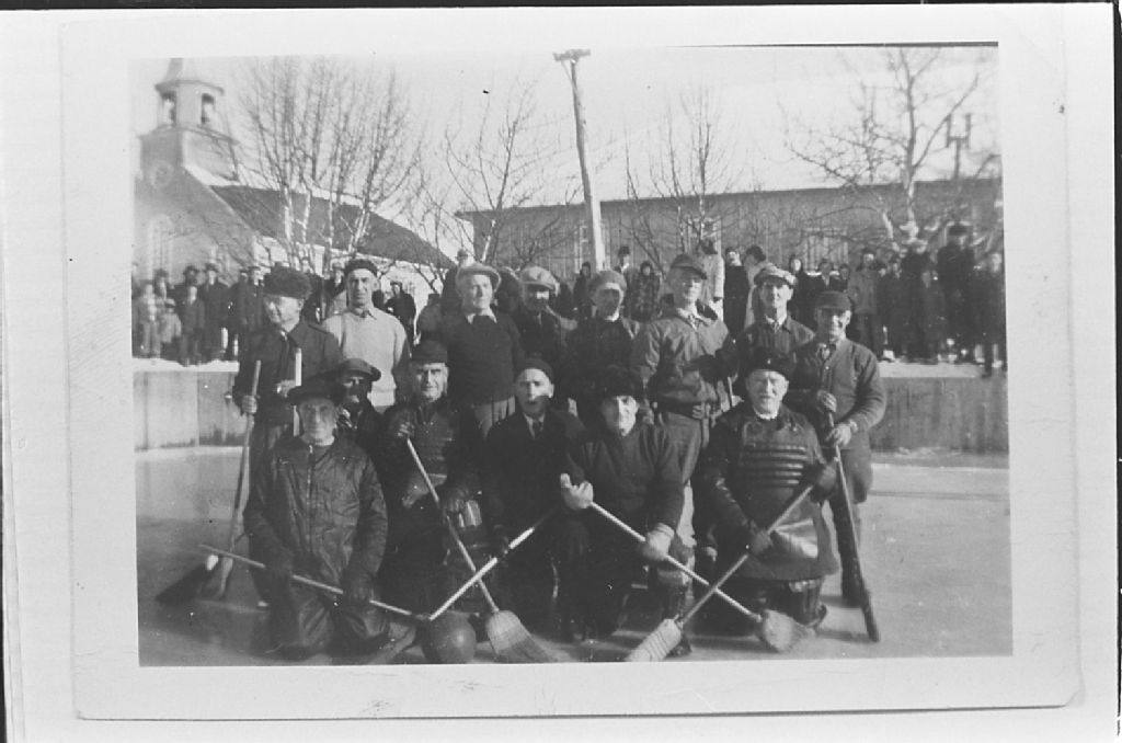 Équipe de ballon-balai à Havre-Saint-Pierre, Négatif reproduit en 1983 (original créé vers 1940), Archives nationales à Sept-Îles, Fonds Société historique de Havre-Saint-Pierre inc, (09N,P19,S1,SS1,P534), Société historique de Havre Saint-Pierre.