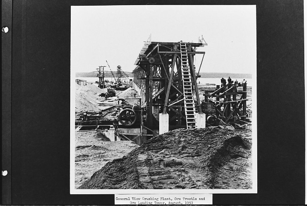 Chargement du minerai à la mine Q.I.T. - Fer et Titane, Négatif reproduit en 1983(original créé en 1950), Archives nationales à Sept-Îles, Fonds Société historique de Havre-Saint-Pierre inc, (09N,P19,S1,SS1,P54), Société historique de Havre Saint-Pierre.