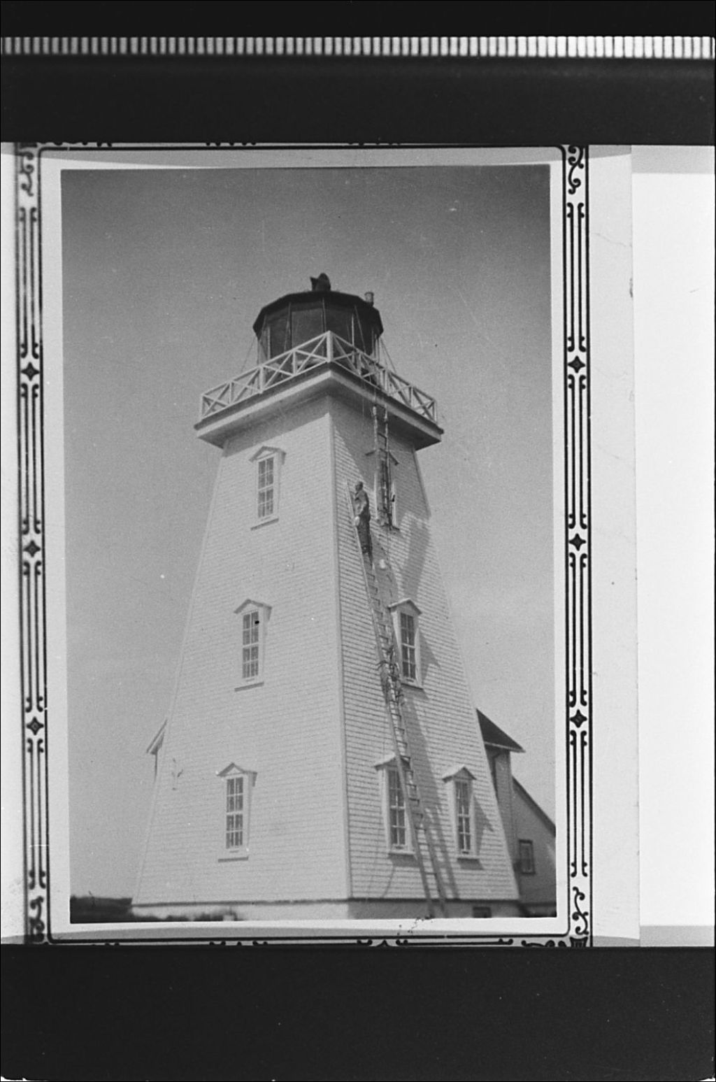 Travaux de peinture sur le phare de l'île aux Perroquets, Négatif reproduit en 1983 (original créé vers 1930), Archives nationales à Sept-Îles, Fonds Société historique de Havre-Saint-Pierre inc., (09N,P19,S1,SS1,P546), Société historique de Havre Saint-Pierre.