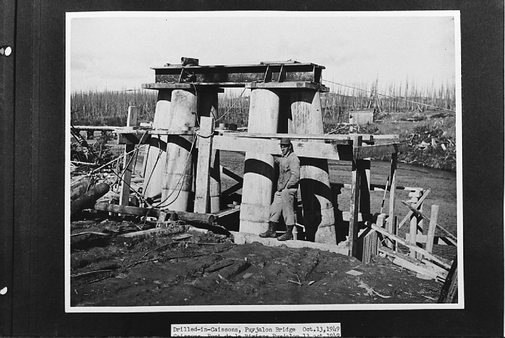 Construction du pont de la rivière Puyjalon, Négatif reproduit en 1983(original créé en 1949), Archives nationales à Sept-Îles, Fonds Société historique de Havre-Saint-Pierre inc, (09N,P19,S1,SS1,P62), Société historique de Havre Saint-Pierre.
