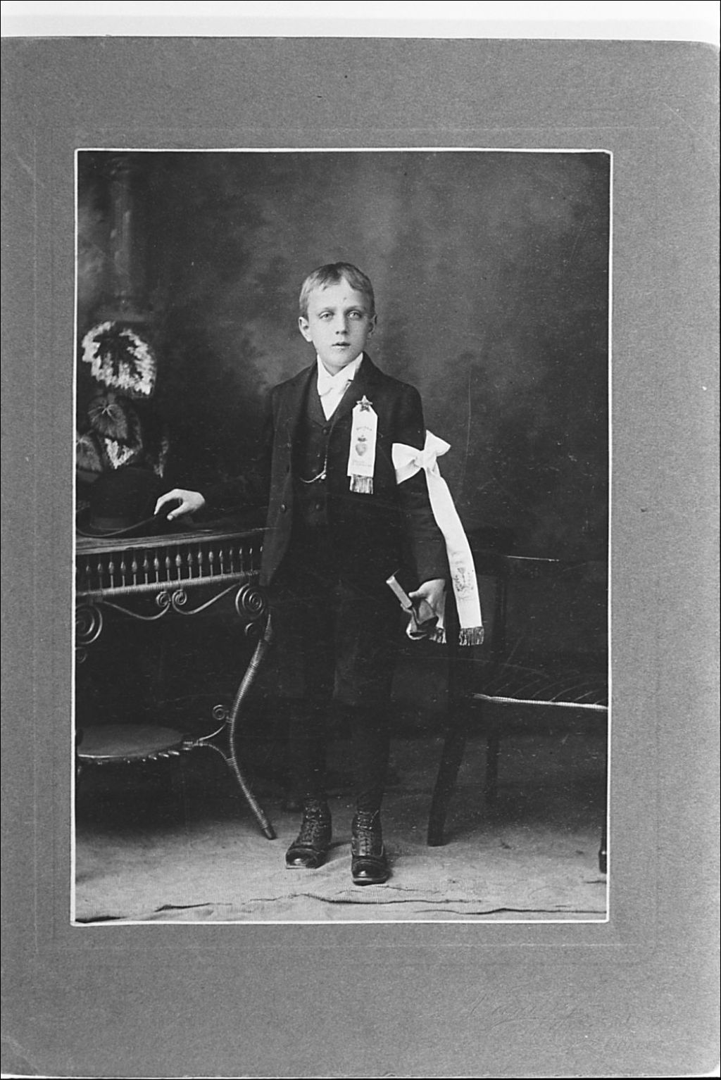 Petit garçon en habit de première communion, Négatif reproduit en 1983 (original créé vers 1920), Archives nationales à Sept-Îles, Fonds Société historique de Havre-Saint-Pierre inc, (09N,P19,S1,SS1,P624), Société historique de Havre Saint-Pierre.