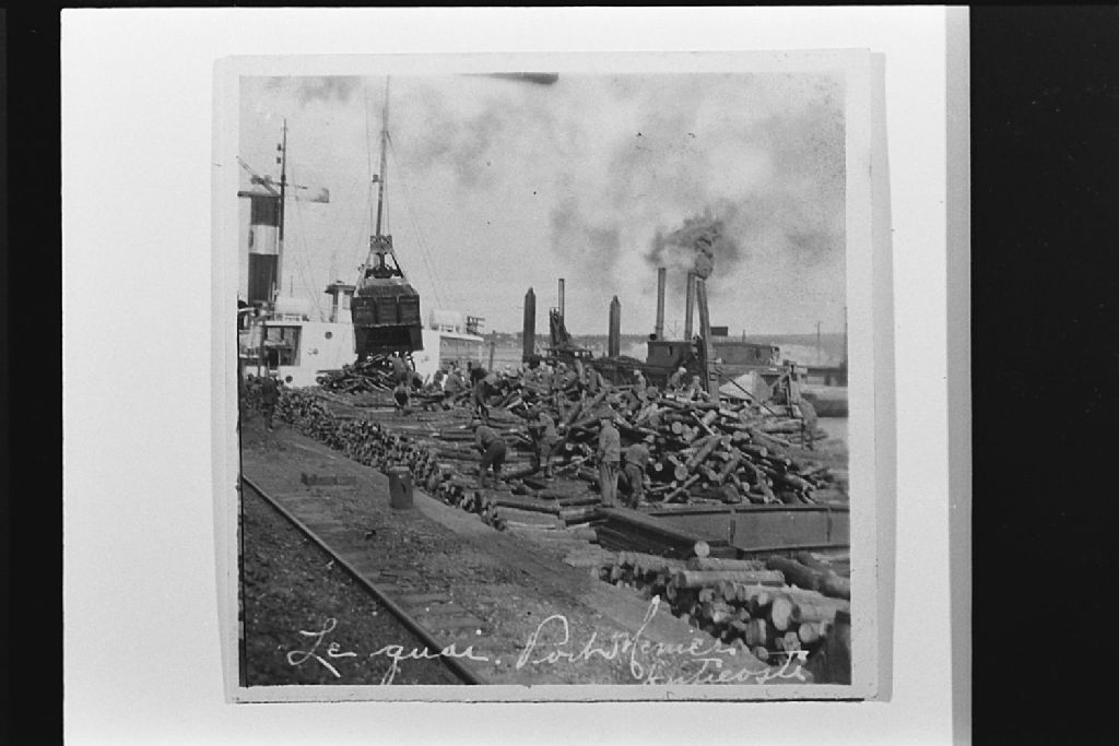 Chargement du bois au quai de Port-Menier, Négatif reproduit en 1983(original créé vers 1928), Archives nationales à Sept-Îles, Fonds Société historique de Havre-Saint-Pierre inc, (09N,P19,S1,SS1,P665), Société historique de Havre Saint-Pierre.