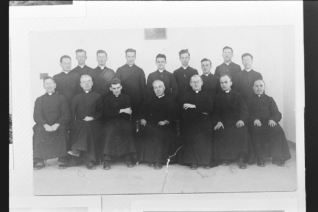 Rassemblement des prêtres Eudistes à Havre-Saint-Pierre, Négatif reproduit en 1983 (original créé vers 1940), Archives nationales à Sept-Îles, Fonds Société historique de Havre-Saint-Pierre inc, (09N,P19,S1,SS1,P719), Société historique de Havre Saint-Pierre.