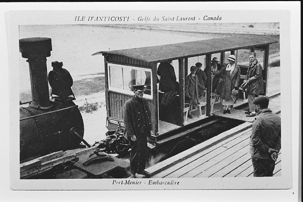 Embarcadère pour train à Port Menier, Négatif reproduit en 1983 (original créé vers 1926), Archives nationales à Sept-Îles, Fonds Société historique de Havre-Saint-Pierre inc, (09N,P19,S1,SS1,P738), Société historique de Havre Saint-Pierre.