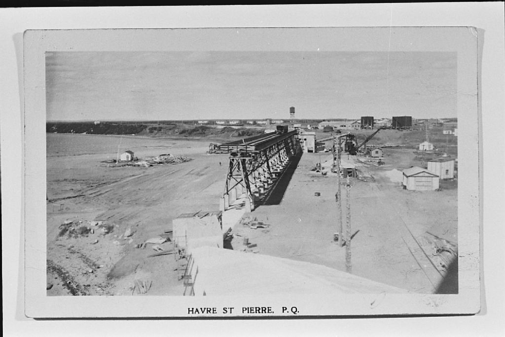 Chargement de minerai à Havre-Saint-Pierre, Négatif reproduit en 1983 (original créé vers 1950), Archives nationales à Sept-Îles, Fonds Société historique de Havre-Saint-Pierre inc, (09N,P19,S1,SS1,P769), Société historique de Havre Saint-Pierre.