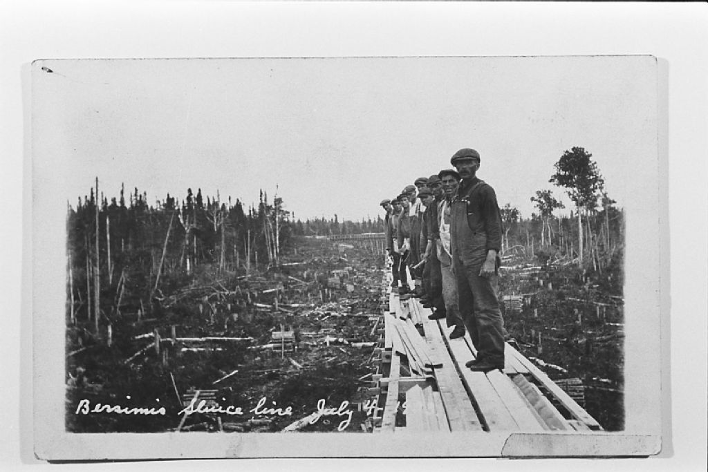 Chantier de Bersimis, Négatif reproduit en 1983 (original créé vers 1926), Archives nationales à Sept-Îles, Fonds Société historique de Havre-Saint-Pierre inc, (09N,P19,S1,SS1,P793), Société historique de Havre Saint-Pierre.