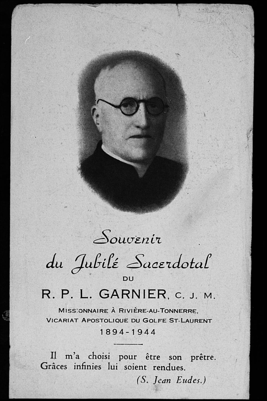 Père Louis Garnier, Négatif reproduit en 1983(original créé vers 1940), Archives nationales à Sept-Îles, Fonds Société historique de Havre-Saint-Pierre inc, (09N,P19,S1,SS1,P877), Société historique de Havre Saint-Pierre.