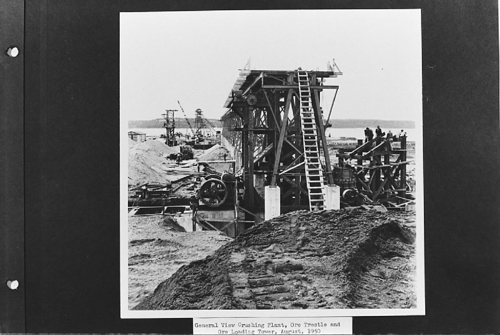 Broyeurs de minerai à la QIT - Fer et Titane inc, Négatif reproduit en 1983(original créé en 1950), Archives nationales à Sept-Îles, Fonds Société historique de Havre-Saint-Pierre inc, (09N,P19,S1,SS1,P92), Société historique de Havre Saint-Pierre.