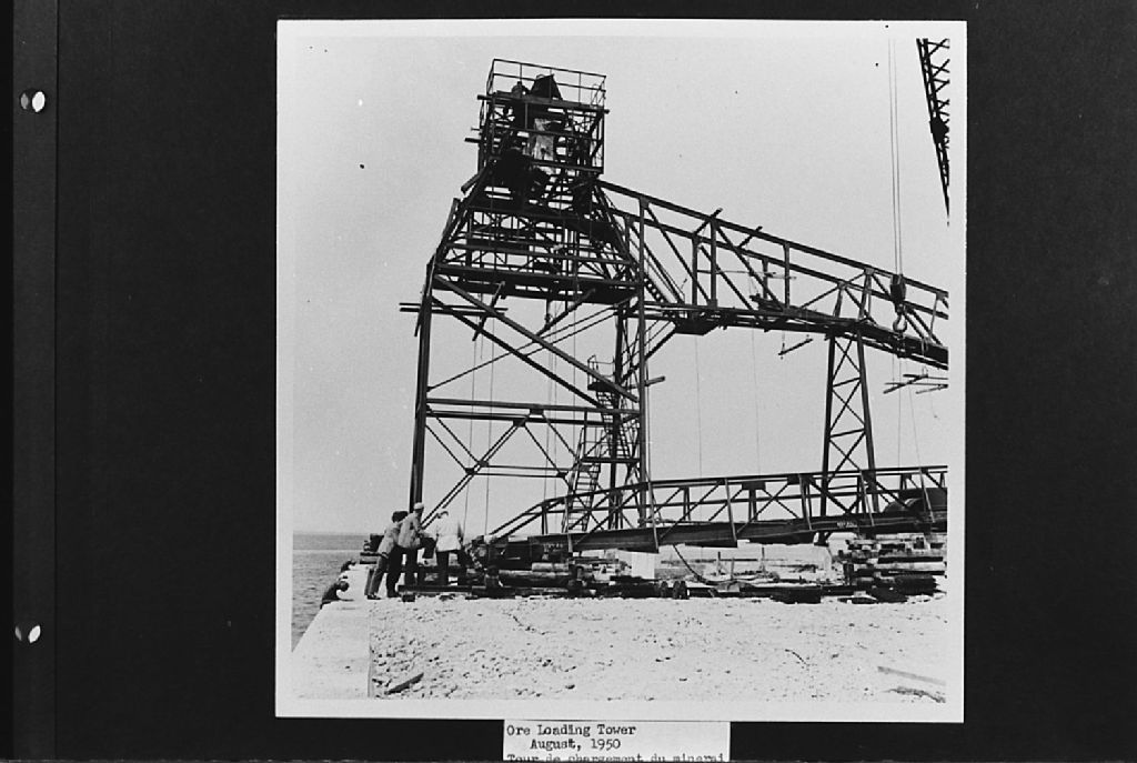 Tour de chargement du minerai à la QIT-Fer et titane, Négatif reproduit en 1983(original créé en 1950), Archives nationales à Sept-Îles, Fonds Société historique de Havre-Saint-Pierre inc, (09N,P19,S1,SS1,P93), Société historique de Havre Saint-Pierre.