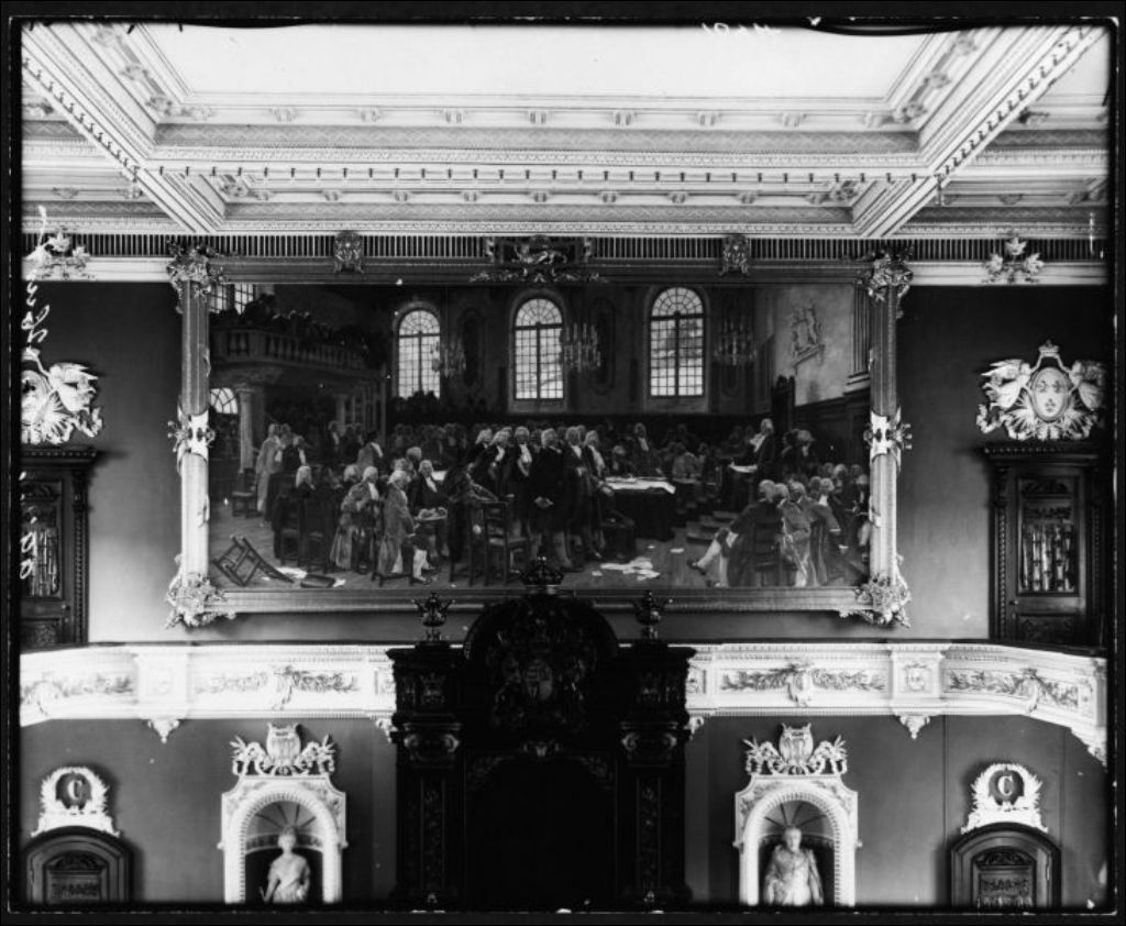 Tableau "Le débat sur les langues " de Charles Huot, dans la salle de l’Assemblée législative, [Après 1913], Archives nationales à Québec, Fonds J. E. Livernois Ltée, (03Q,P560,S1,P1074), Photographe non identifié.